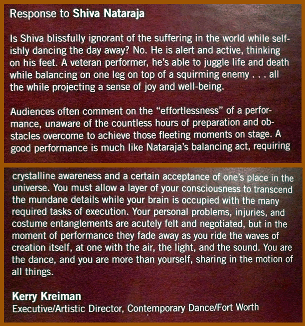 Utilizing the imagery of muses integrated with ideas from the art featured in the exhibition, choreographer Kerry Kreiman and members of the Contemporary Dance/Fort Worth company designed this dance to highlight the universal nature of creative inspiration across cultures and across art forms. Through simple props and a variety of costumes by costume designer Crickett Pettigrew, the idea of "transformation" in performance and ritual is visually reinforced -- a theme which is highlighted within the exhibition.